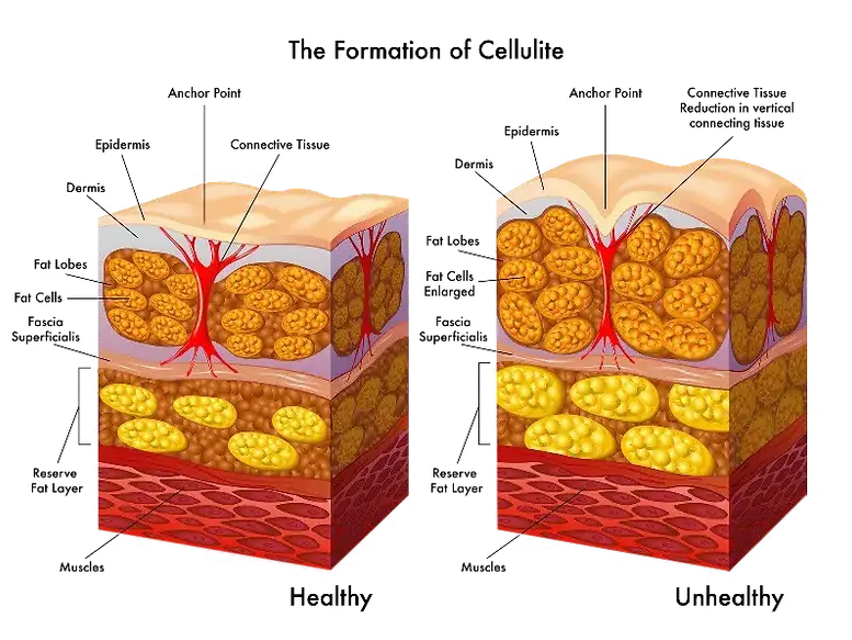 Cellulite consists of enlarged adipose tissue or fat cells and is a type of connective tissue that is classified as a connective tissue disorder. Due to low collagen production, the connective tissue allows the fat cells to rise towards the skin. Because of this, cellulite (fat cells) bulge and push upwards towards the dermis giving the “orange peel” or “dimpling” effect at the dermis level in different grades. We place these into four grades or types: